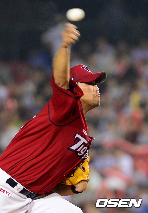 24일 오후 서울 잠실구장에서 열린 '2013 한국야쿠르트 세븐 프로야구' LG 트윈스와 KIA 타이거즈의 경기 5회말 김진우가 역투하고 있다.
