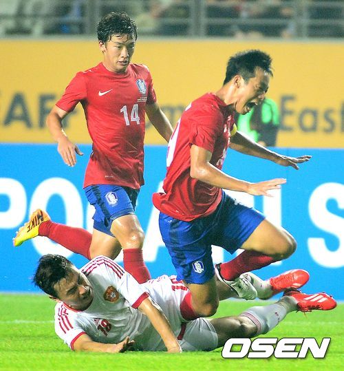 전반 한국 염기훈이 중국 수비수에 걸려 넘어지고 있다.