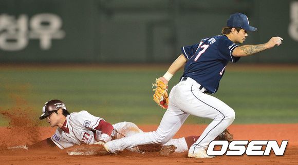 24일 오후 서울 목동야구장에서 '2013 한국야쿠르트 세븐 프로야구' 넥센 히어로즈 대 두산 베어스의 경기가 열렸다. 6회말 넥센 공격 2사 1루 상황 두산 2루수 오재원이 포수 최재원의 송구를 받아 2루 도루를 시도하던 장기영을 태그아웃 시킨 뒤 더그아웃으로 향하고 있다.