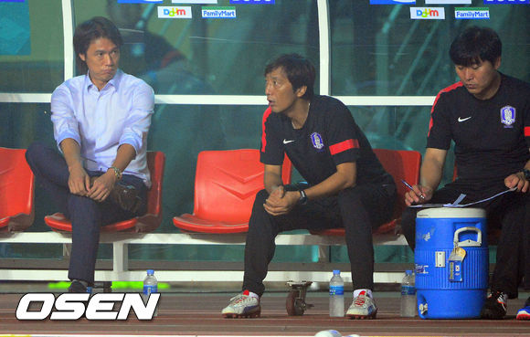 24일 오후 화성종합경기타운에서 열린 2013 동아시안컵 축구선수권대회 남자부 2차전 한국과 중국의 경기 후반 홍명보 감독이 안타까운 심정으로 경기를 지켜보고 있다