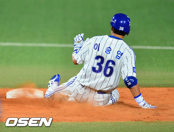 24일 오후 대구시민구장에서 열린 2013 한국야쿠르트 세븐프로야구 삼성 라이온즈와 NC 다이노스의 경기, 9회말 선두타자 삼성 이승엽이 우중간 2루타를 날린 후 2루에 몸을 날리고 있다.