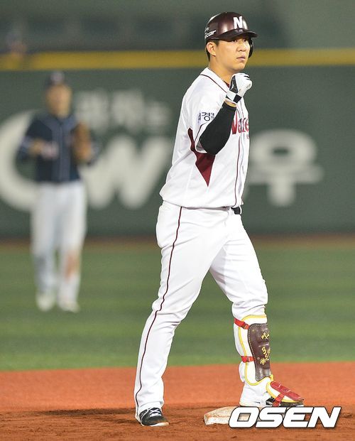 24일 오후 서울 목동야구장에서 '2013 한국야쿠르트 세븐 프로야구' 넥센 히어로즈 대 두산 베어스의 경기가 열렸다. 7회말 넥센 공격 1사 1, 3루 상황 6번타자 김민성이 동점 1타점 좌익선상 2루타를 날리고 2루에 안착해 주먹을 쥐며 기뻐하고 있다.