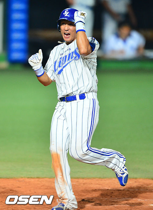 24일 오후 대구시민구장에서 열린 2013 한국야쿠르트 세븐프로야구 삼성 라이온즈와 NC 다이노스의 경기, 9회말 무사 주자 1,2루 삼성 박석민의 중견수 왼쪽 1타점 적시타때 홈을 밟은 이승엽이 홈에서 기뻐하고 있다.