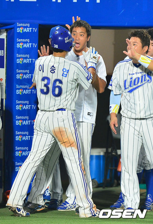 24일 오후 대구시민구장에서 열린 2013 한국야쿠르트 세븐프로야구 삼성 라이온즈와 NC 다이노스의 경기, 9회말 무사 주자 1,2루 삼성 박석민의 중견수 왼쪽 1타점 적시타때 홈을 밟은 이승엽이 덕아웃에서 채태인과 하이파이브를 하고 있다.