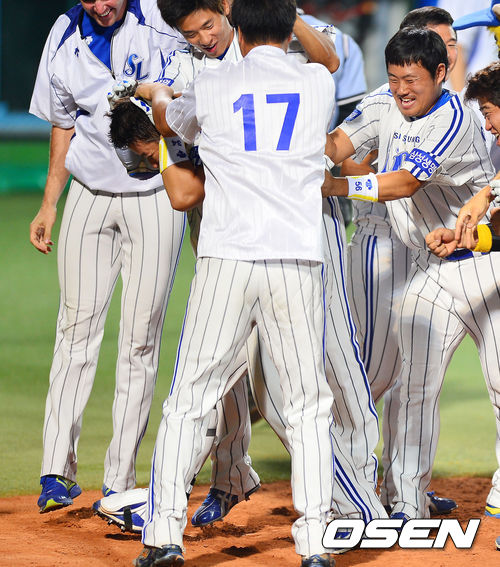 24일 오후 대구시민구장에서 열린 2013 한국야쿠르트 세븐프로야구 삼성 라이온즈와 NC 다이노스의 경기, 연장 10회말 2사 주자 없는 상황에서 삼성 최형우가 끝내기 홈런을 날린 후 덕아웃에서 동료들에게 축하를 받고 있다.