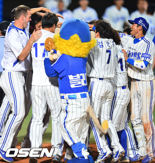24일 오후 대구시민구장에서 열린 2013 한국야쿠르트 세븐프로야구 삼성 라이온즈와 NC 다이노스의 경기, 연장 10회말 2사 주자 없는 상황에서 삼성 최형우가 끝내기 홈런을 날린 후 덕아웃에서 동료들과 기쁨을 나누고 있다.