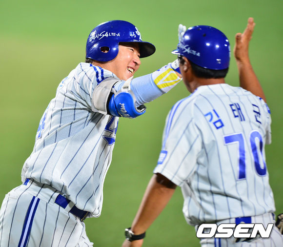 24일 오후 대구시민구장에서 열린 2013 한국야쿠르트 세븐프로야구 삼성 라이온즈와 NC 다이노스의 경기, 연장 10회말 2사 주자 없는 상황에서 삼성 최형우가 끝내기 홈런을 날린 후 1루에서 김태균 코치와 하이파이브를 하고 있다.