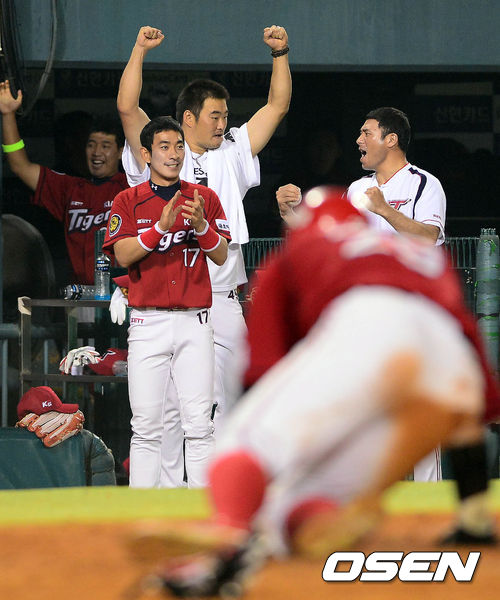 24일 오후 서울 잠실구장에서 열린 '2013 한국야쿠르트 세븐 프로야구' LG 트윈스와 KIA 타이거즈의 경기 9회초 1사 1,2루 김주형의 1타점 적시타에 나지완이 득점하자 김진우가 환호하고 있다.