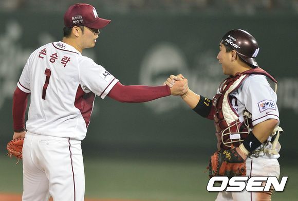 경기를 마무리지은 넥센 마무리투수 손승락과 포수 허도환이 승리의 기쁨을 나누고 있다./dreamer@osen.co.kr