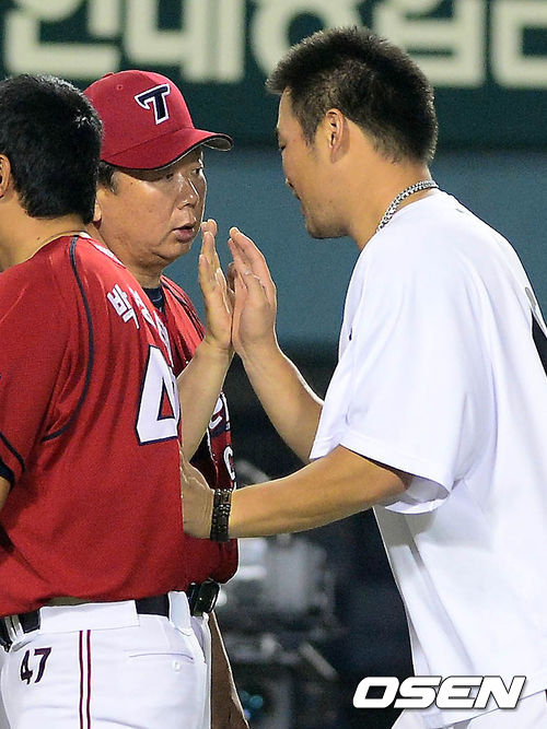 24일 오후 서울 잠실구장에서 열린 '2013 한국야쿠르트 세븐 프로야구' LG 트윈스와 KIA 타이거즈의 경기 종료 후 선동렬 감독이 김진우와 하이파이브를 하고 있다.