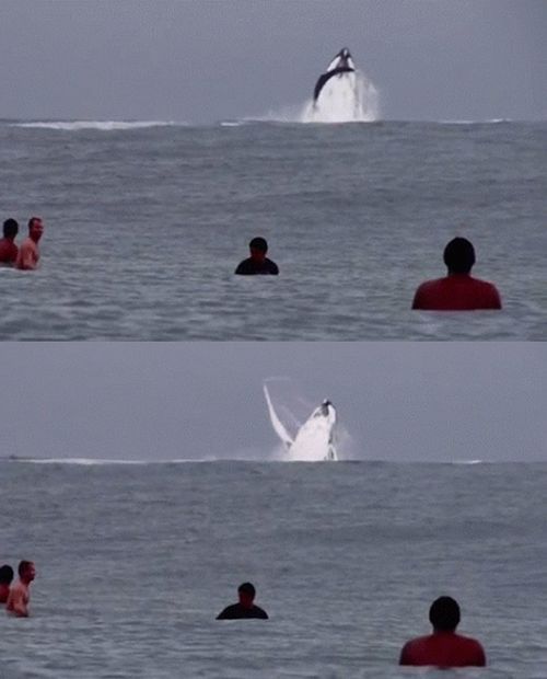 이 사진을 보면 서핑을 즐기고 있는 사람들 뒤로 어마어마한 크기의 고래가 수면 위로 솟구쳐 오른 후 다시 바다로 다이빙하고 있다. 실제 영상에서는 고래가 떨어지면서 튀는 물보라가 상상을 초월했다.