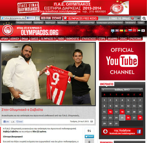 아르헨티나 대표팀 출신의 공격수 하비에르 사비올라(32)가 그리스의 올림피아코스와 2년 계약을 맺었다.