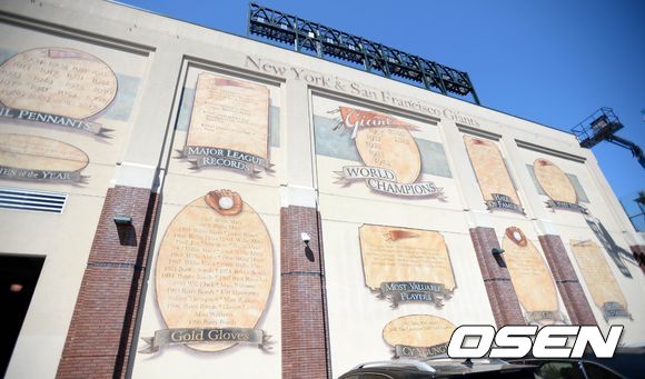 25일(한국시간) 미국 캘리포니아주 샌프란시스코에서 열린 2013 메이저리그 샌프란시스코 자이언츠와 신시내티 레즈의 경기, 샌프란시스코의 홈구장인 AT&T 파크 한쪽 벽에 구단의 역사가 그려져 있다.