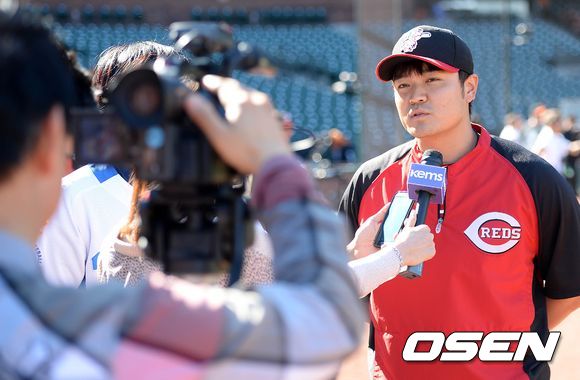25일(한국시간) 미국 캘리포니아주 샌프란시스코 AT&T 파크에서 열린 2013 메이저리그 샌프란시스코 자이언츠와 신시내티 레즈의 경기, 경기에 앞서 신시내티 추신수가 방송 인터뷰를 하고 있다.