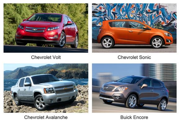 차종별로 쉐보레 소형차 '소닉(Sonic, 국내판매명: 아베오)', 전기차 '볼트(Volt)', 픽업트럭 '아발란쉬(Avalanche)'가 각각 소형차, 준중형차, 픽업트럭 부문 1위에 올랐으며 뷰익 '앙코르(Buick Encore)' 또한 소형 CUV 부문 최고점을 받았다.