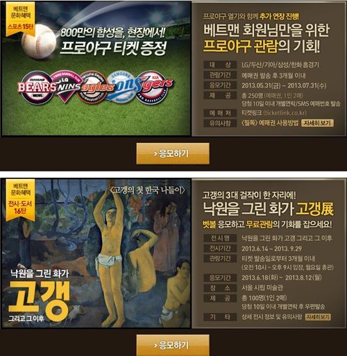 먼저 2013 프로야구 경기를 관람할 수 있는 입장권을 제공하는 컬처라운지 이벤트 스포츠 15탄이 오는 31일까지 진행 중이다. 응모자 가운데 총 250명(1인 2매)을 추첨해 LG, 두산, KIA, 삼성, 한화의 홈경기를 무료로 관람할 수 있는 티켓을 증정한다. 벳볼 100개 이상을 보유한 베트맨 회원은 누구나 응모가 가능하다.