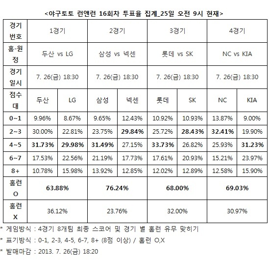 [야구토토] 국민체육진흥공단(www.kspo.or.kr)이 발행하는 체육진흥투표권 수탁사업자인 스포츠토토 공식 온라인 발매 사이트인 베트맨(www.betman.co.kr)이 오는 26일 오후 6시 30분부터 열리는 2013 국내프로야구(KBO) 4경기 8개 팀을 대상으로 한 야구토토 런앤런 16회차 투표율 중간집계 결과, 참가자들의 대다수인 76.24%는 삼성-넥센(2경기)전에서 홈런이 나올 것으로 예상했다고 밝혔다.