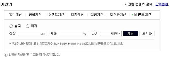 성별,신장,체중,나이를 입력하면 계산법에 따라 18.5이하면 저체중, 18.5~23은 정상, 23~25는 과체중, 25~30은 비만, 30 이상은 고도비만으로 분류하며 자신의 비만도를 알려주는 계산법이다.