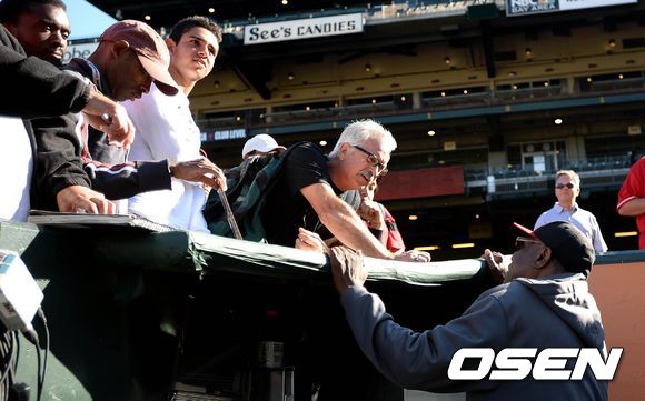 25일(한국시간) 미국 캘리포니아주 샌프란시스코 AT&T 파크에서 열린 2013 메이저리그 샌프란시스코 자이언츠와 신시내티 레즈의 경기, 경기에 앞서 신시내티 더스티 베이커 감독이 팬들과 이야기를 나누고 있다.