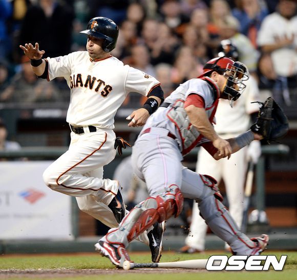 25일(한국시간) 미국 캘리포니아주 샌프란시스코에서 열린 2013 메이저리그 샌프란시스코 자이언츠와 신시내티 레즈의 경기, 3회말 1 2루에서 샌프란시스코 펜스의 중전 적시타 때 2루주자 스쿠타로가 홈으로 쇄도하며 신시내티 포수 메소라코를 피하고 있다.