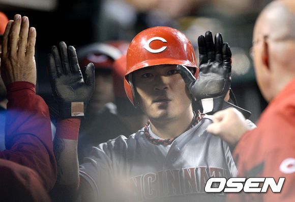 25일(한국시간) 미국 캘리포니아주 샌프란시스코에서 열린 2013 메이저리그 샌프란시스코 자이언츠와 신시내티 레즈의 경기, 4회초 1사 1,3루 신시내티 필립스의 희생플라이 때 홈을 밟은 3루주자 추신수가 덕아웃에서 동료들과 환호하고 있다.