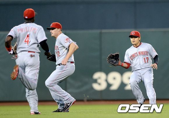 25일(한국시간) 미국 캘리포니아주 샌프란시스코에서 열린 2013 메이저리그 샌프란시스코 자이언츠와 신시내티 레즈의 경기, 3회말 1사 1루에서 신시내티 브루스와 추신수가 사인미스로 샌프란시스코 벨트의 타구를 놓치고 있다.