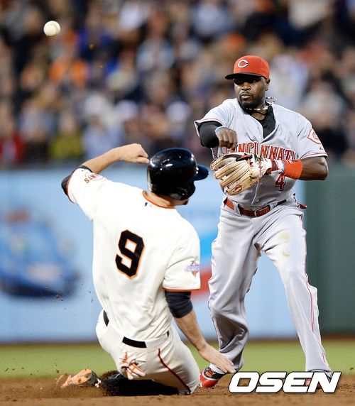 25일(한국시간) 미국 캘리포니아주 샌프란시스코에서 열린 2013 메이저리그 샌프란시스코 자이언츠와 신시내티 레즈의 경기, 3회말 1사 1,2루에서 신시내티 필립스가 1루주자 벨트를 포스아웃 처리하고 1루로 공을 던지고 있다.
