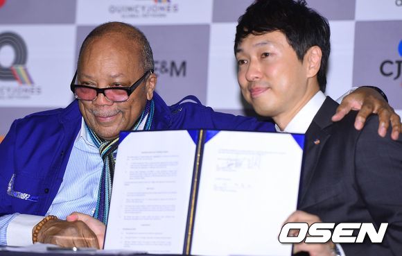'팝의 거장' 퀸시 존스가 25일 오후 서울 삼성동 인터콘티넨탈 서울 코엑스에서 열린 내한 기자간담회 및 'CJ E&M과의 글로벌 뮤직 파트너십 MOU 체결식'에 참석해 안석준 음악사업부문 대표와 포즈를 취하고 있다.
