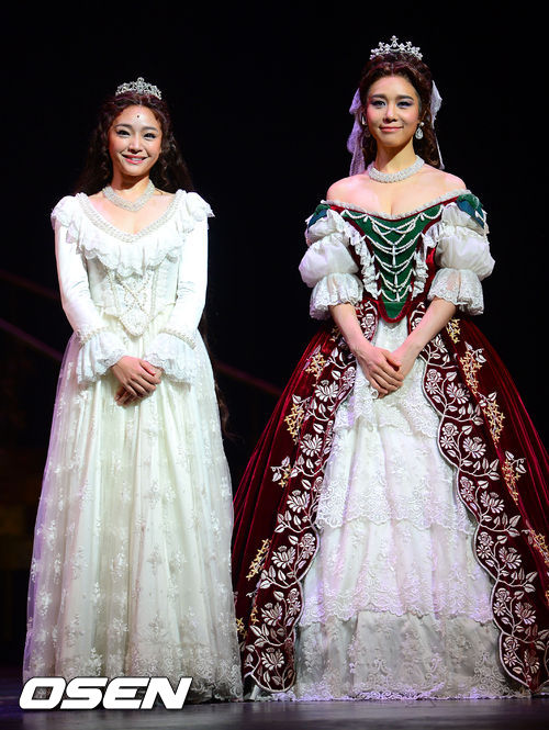 25일 오후 서울 예술의 전당 오페라 극장에서 열린 뮤지컬 '엘리자벳' 프레스콜에서 엘리자벳 역을 맡은 배우 김소현과 옥주현이 포즈를 취하고 있다.