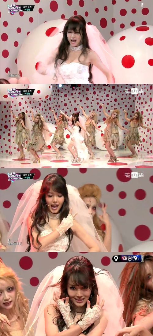 이날 이순백의 웨딩드레스를 입고 등장한 이정현, 퍼포먼스의 여왕답게 강렬한 무대를 보여줬다. 특히 이정현은 특유의 도발적인 눈빛과 과격한 댄스로 무대를 휘어잡았다.