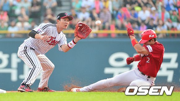 25일 오후 서울 잠실야구장에서 '2013 한국야쿠르트 세븐 프로야구' LG 트윈스 대 KIA 타이거즈의 경기가 열렸다. 1회초 KIA 공격 2사 1루 상황 주자 신종길이 도루를 시도하다 LG 포수 윤요섭의 송구에 걸려 태그아웃 되고 있다. 포구하는 LG 2루수 손주인.
