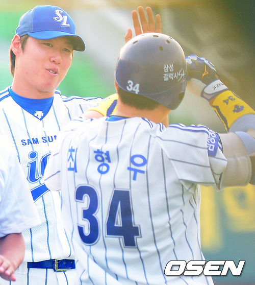 25일 오후 대구시민구장에서 열린 2013 한국야쿠르트 세븐프로야구 삼성 라이온즈와 NC 다이노스의 경기, 1회말 2사 주자 없는 상황에서 삼성 최형우가 중월 솔로 홈런을 날린 후 덕아웃에서 선발 차우찬과 하이파이브를 하고 있다.