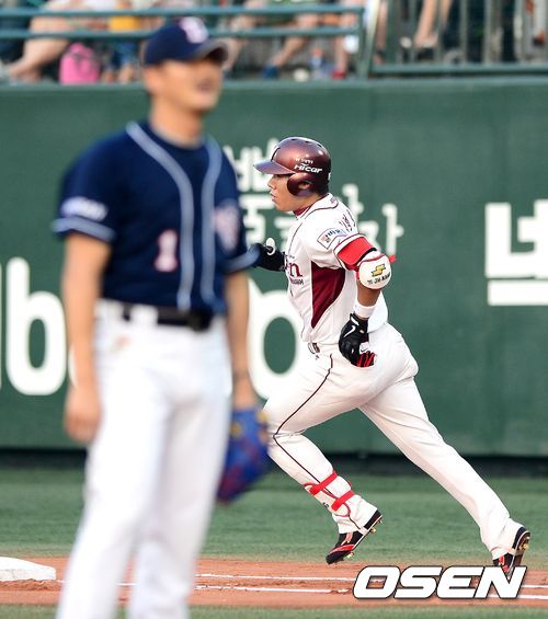 1회말 2사 1,2루에서 넥센 강정호가 역전 스리런포를 날리고 그라운드를 돌고 있다.