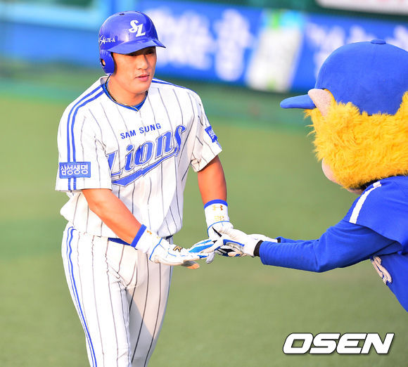 25일 오후 대구시민구장에서 열린 2013 한국야쿠르트 세븐프로야구 삼성 라이온즈와 NC 다이노스의 경기, 1회말 2사 주자 1루 삼성 채태인의 우중간 1타점 적시타때 홈을 밟은 이승엽이 덕아웃으로 들어가며 마스코트와 하이파이브를 하고 있다.