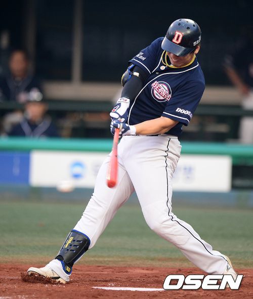 3회초 1사 2루에서 두산 김현수가 동점 우전 적시타를 날리고 있다.