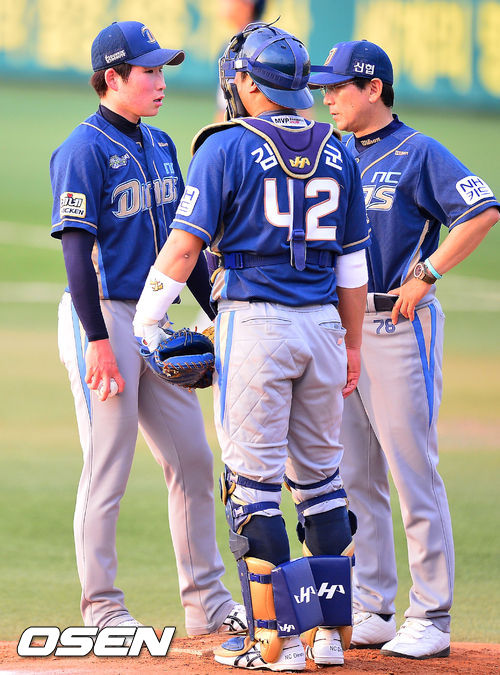 25일 오후 대구시민구장에서 열린 2013 한국야쿠르트 세븐프로야구 삼성 라이온즈와 NC 다이노스의 경기, 1회말 2사 주자 1루 삼성 채태인의 우중간 1타점 적시타를 맞은 NC 선발 이재학이 최일언 투수코치와 얘기를 나누고 있다.