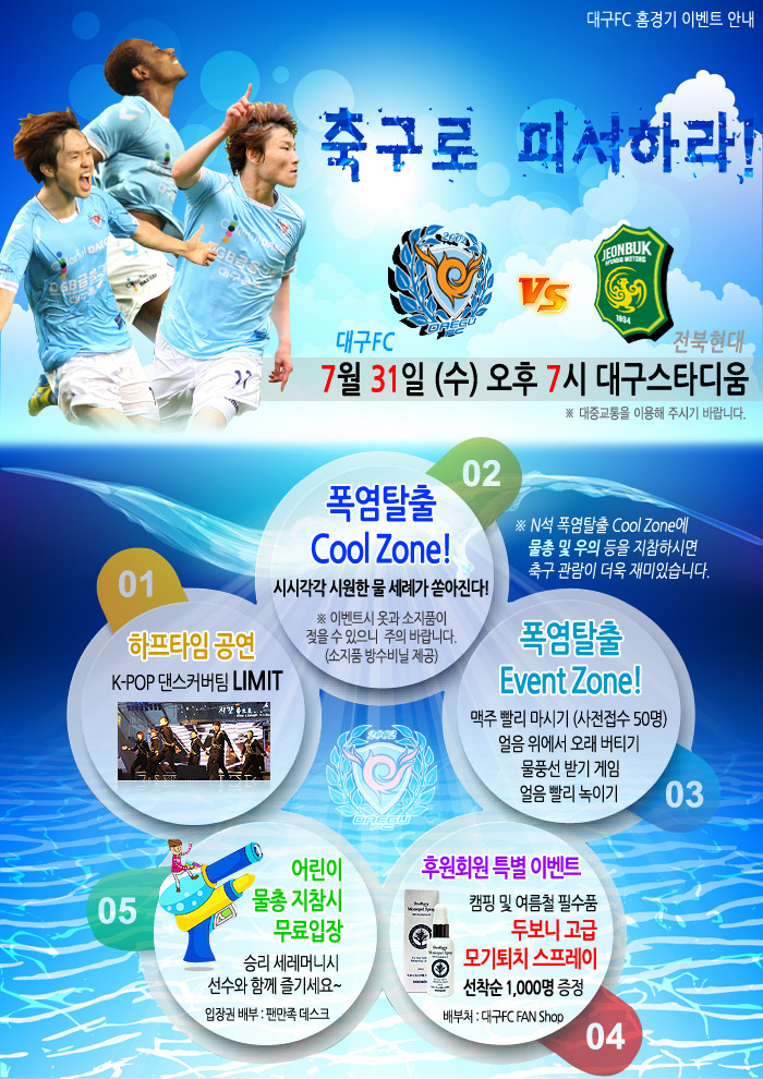 대한민국에서 가장 뜨거운 태양과 열정으로 후끈함을 자랑하는 도시 대구광역시를 대표하는 시민구단 대구FC가 유난히 무더운 올 여름 날씨에 지친 대구시민들을 위해 특별한 홈 2연전을 준비했다. 대구FC가 오는 31일과 내달 3일 저녁 7시에 열리는 2013 현대오일뱅크 K리그 클래식 전북전, 포항전 홈2연전에서 대구스타디움을 여름 피서지로 만든다.
