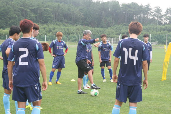 본격적인 훈련에 앞서 간단한 공 돌리기 훈련을 하던 중 후배 선수의 하극상(?) 발언이 필드에 울려 퍼졌다. 하지만, 당사자인 주장 유경렬의 표정은 밝기만 하다. 도리어 가벼운 농담으로 맞받아친다.