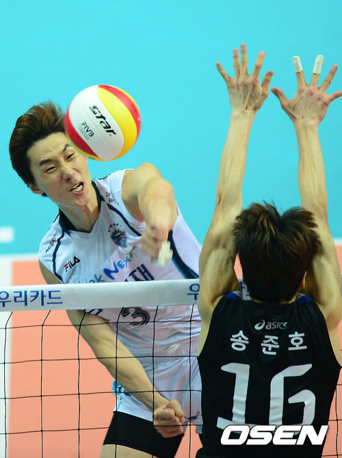 25일 오후 경기도 안산시 상록수체육관에서 열린 '2013 안산-우리카드컵 프로배구대회' 남자부 현대캐피탈과 삼성화재의 경기, 3세트 삼성화재 박철우가 스파이크를 때리고 있다.