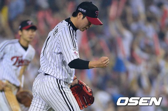25일 오후 서울 잠실야구장에서 '2013 한국야쿠르트 세븐 프로야구' LG 트윈스 대 KIA 타이거즈의 경기가 열렸다. 6회초 KIA 공격 2사 만루 상황, 4번타자 나지완을 중견수 플라이로 잡아낸 LG 선발 우규민이 주먹을 불끈 쥐며 환호하고 있다.
