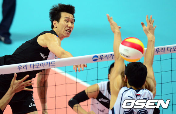 25일 오후 경기도 안산시 상록수체육관에서 열린 '2013 안산-우리카드컵 프로배구대회' 남자부 현대캐피탈과 삼성화재의 경기, 1세트 현대캐피탈 임동규가 스파이크를 때리고 있다.