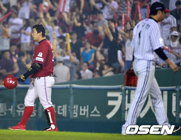25일 오후 서울 잠실야구장에서 '2013 한국야쿠르트 세븐 프로야구' LG 트윈스 대 KIA 타이거즈의 경기가 열렸다. 6회초 KIA 공격 2사 만루 상황, 4번타자 나지완이 LG 선발 우규민을 상대로 중견수 플라이로 물러난 뒤 아쉬워하고 있다.