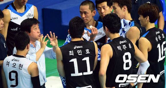 25일 오후 경기도 안산시 상록수체육관에서 열린 '2013 안산-우리카드컵 프로배구대회' 남자부 현대캐피탈과 삼성화재의 경기, 현대캐피탈 김호철 감독이 선수들에게 작전지시를 하고 있다.