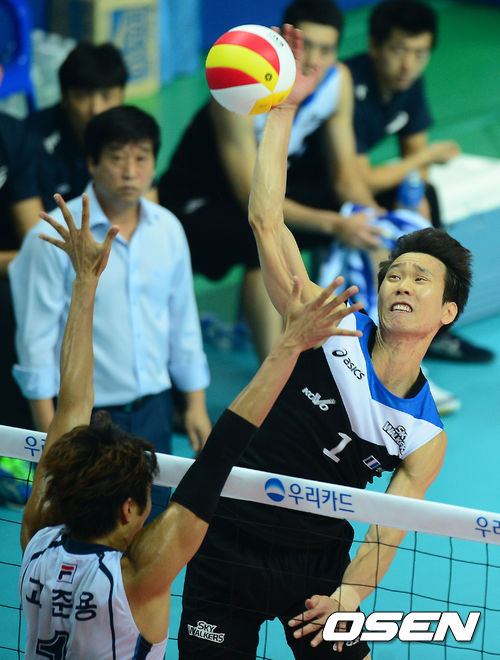 25일 오후 경기도 안산시 상록수체육관에서 열린 '2013 안산-우리카드컵 프로배구대회' 남자부 현대캐피탈과 삼성화재의 경기, 2세트 현대캐피탈 임동규가 스파이크를 때리고 있다.