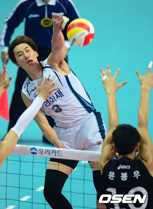 25일 오후 경기도 안산시 상록수체육관에서 열린 '2013 안산-우리카드컵 프로배구대회' 남자부 현대캐피탈과 삼성화재의 경기, 3세트 삼성화재 박철우가 공격을 시도하고 있다.