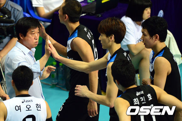 25일 오후 경기도 안산시 상록수체육관에서 열린 '2013 안산-우리카드컵 프로배구대회' 남자부 현대캐피탈과 삼성화재의 경기, 현대캐피탈 김호철 감독이 2세트를 따낸 뒤 선수들과 하이파이브를 하고 있다.