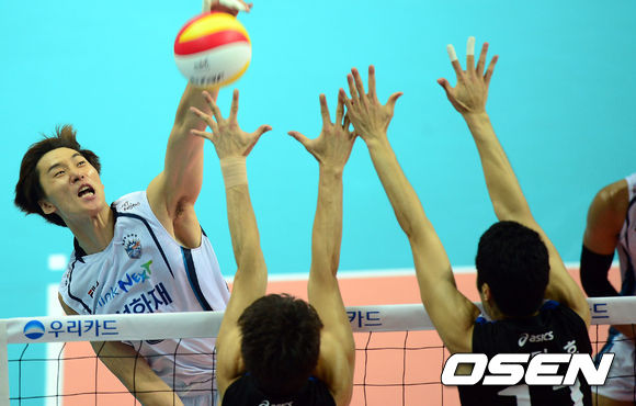 25일 오후 경기도 안산시 상록수체육관에서 열린 '2013 안산-우리카드컵 프로배구대회' 남자부 현대캐피탈과 삼성화재의 경기, 삼성화재 박철우가 공격을 시도하고 있다.