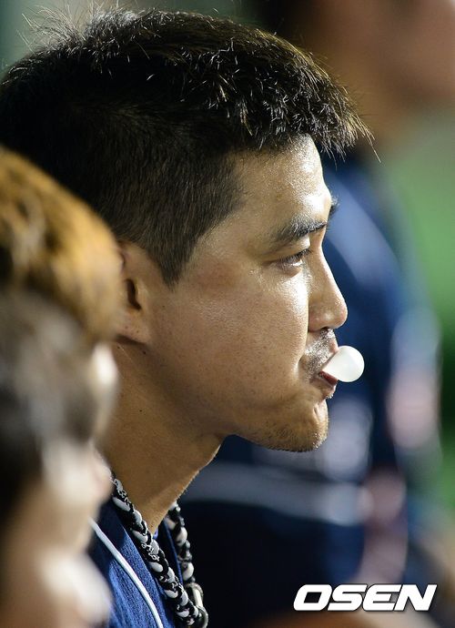 5회말 두산 홍성흔이 풍선껌을 불며 경기를 지켜보고 있다.