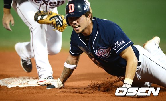 6회초 2사 2,3루에서 두산 오재원이 최재훈 타석에 넥센 김상수의 폭투에 진루 실패하며 김민성에 태그아웃당하고 있다.
