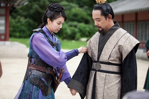 이번에 공개된 사진에는 연개소문(최민수 분)과 대접전을 펼치게 될 열병식을 앞두고 있는 아버지 영류왕(김영철 분)과 공주(김옥빈 분)의 애틋한 마음이 담겼다. 땅을 바라보며 깊은 생각에 잠긴 영류왕의 표정에는 비장함과 착잡한 심정이 복잡하게 얽혀 있다.